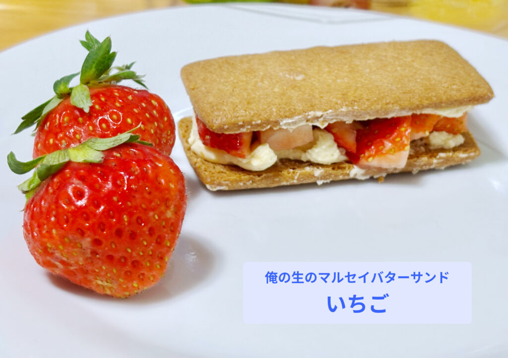 バターといちご。火を見るよりも明らかな組み合わせで、やはりうまい。これは商品としてあったほうが良いと思う。ただ、生のいちごの味や風味の強さでは、バタークリームに負けてしまってバランスがむずかしいとも思った。「俺の生マルセイバターサンド」の趣旨とは離れるが、生いちごではなく、いちごジャムをサンドするとめちゃくちゃうまいと思う。